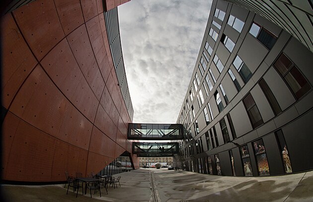Plzeňská radnice uvažuje o zastřešení obrovského atria mezi provozní budovou a hledištěm Nového divadla J. K. Tyla v Plzni. (10. března 2023)