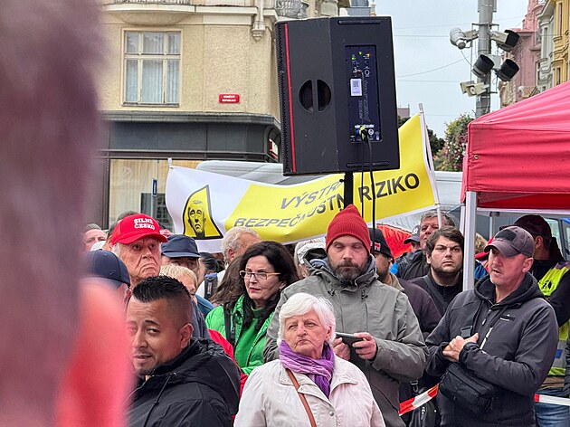 Na mítinku v Plzni se objevil žlutý transparent s fotkou Andree Babiše a nápisem Výstraha, bezpečnostní riziko. (25. září 2025)