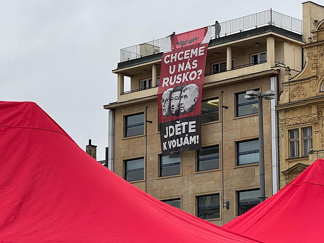 Na jedné z budov u náměstí Republiky se objevil transparent s nápisem Chceme u nás Rusko? Jděte k volbám. (25. 9. 2025) )