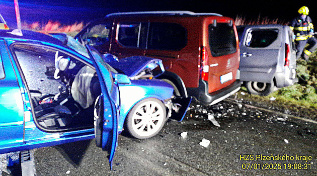 Do peugeotu navíc zezadu narazilo druhé auto stejné značky, kdy osmačtyřicetiletý šofér nestačil na namrzlé silnici včas zareagovat na situaci před ním.