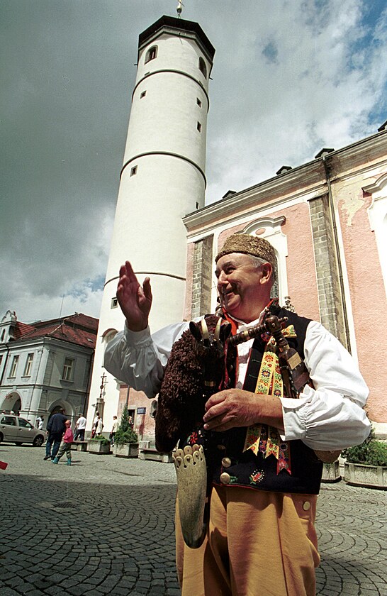 Vedoucí folklórního souboru Konrádyho dudácká muzika Antonín Konrády na domažlickém náměstí. (10. srpna 2002)