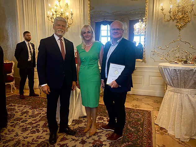 Prezident Petr Pavel ocenil ředitele ZŠ v Domažlicích Ivana Rybára (na snímku s manželkou). Ředitel přesvědčil školačku, aby zahodila nůž. Předtím jím pobodala dva spolužáky. (30. září 2025)