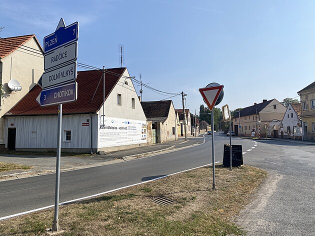 Z této dopravní značky Dej přednost v jízdě umístěné v Malesicích řidiči jen těžko poznají, komu je určená. Navíc je schovaná za rozcestníkem se čtyřmi směrovými ukazateli a šoféři ji zahlédnou na poslední chvíli. (3. září 2024)