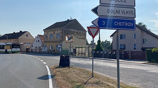 Z této dopravní značky Dej přednost v jízdě umístěné v Malesicích řidiči jen těžko poznají, komu je určená. Navíc je schovaná za rozcestníkem se čtyřmi směrovými ukazateli a šoféři ji zahlédnou na poslední chvíli. (3. září 2024)