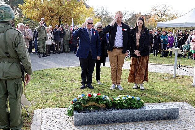Památník v Kříších na Rokycansku byl odhalen veteránovi z druhé světové války Earlovi Ingramovi. (1. listopadu 2025)