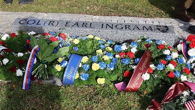 Památník v Kříších na Rokycansku byl odhalen veteránovi z druhé světové války Earlovi Ingramovi. (1. listopadu 2025)