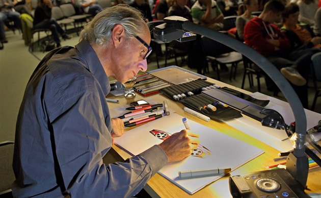 Corbi na přednášce také názorně ukázal, jak sám tvoří. Během necelé půlhodiny namaloval model auta, nad nímž studenti uznale pokyvovali hlavou. „Dalo by se to udělat i líp, ale nebyl čas,“ skromně hodnotil výkon Corbi.