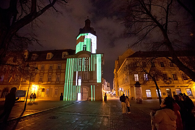 Instalace festivalu světla Blik Blik v centru Plzně. Akce se koná v pátek a v sobotu. (21. března 2024)