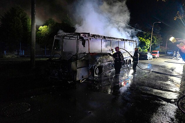 Noční požár zaparkovaný autobus v Plzni zcela zničil.