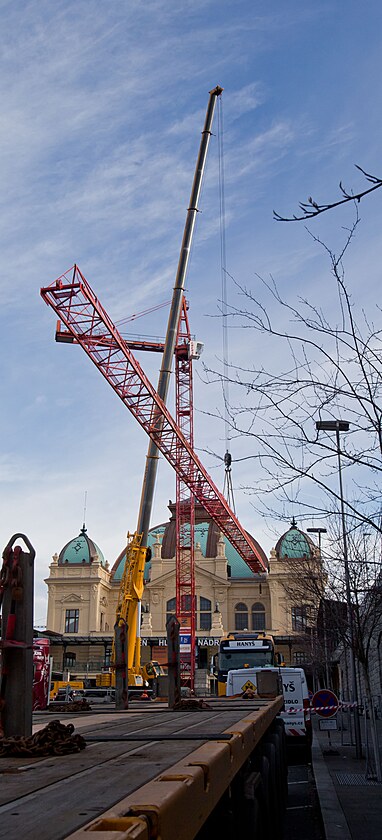 Technici specializované firmy demontovali obří jeřáb, končí rekonstrukce budovy hlavního nádraží v Plzni. (19. prosince 2023)