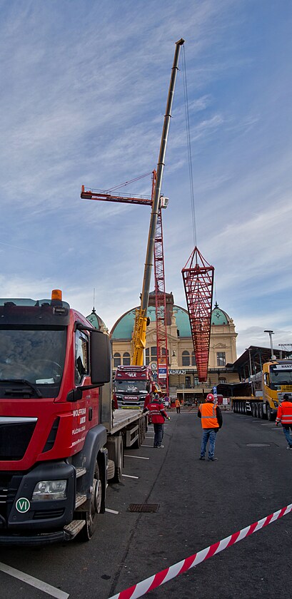 Technici specializované firmy demontovali obří jeřáb, končí rekonstrukce budovy hlavního nádraží v Plzni. (19. prosince 2023)