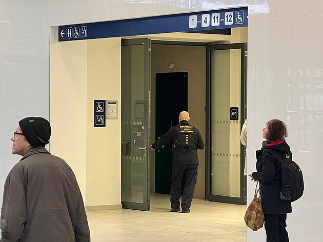 Ženy, které opouštějí toalety na Hlavním nádraží v Plzni, vidí v odraze zrcadla, co se děje u pánských mušlí. Vchod do toalet střeží muž z ostrahy. (27. října 2025)