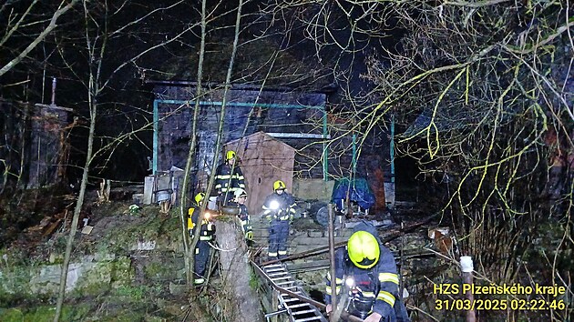 Požár chaty u hradu Buben na Plzeňsku. Hasiči měli přístup k objektu značně komplikovaný. (31. března 2025)