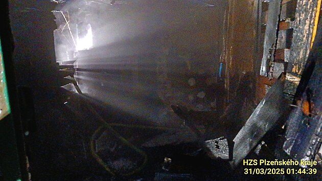 Požár chaty u hradu Buben na Plzeňsku. Hasiči měli přístup k objektu značně komplikovaný. (31. března 2025)