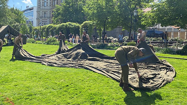 Nadšenci do vojenské historie stavěli v Šafaříkových sadech kemp 16. obrněné divize armády USA včetně polní nemocnice. (1. května 2025)