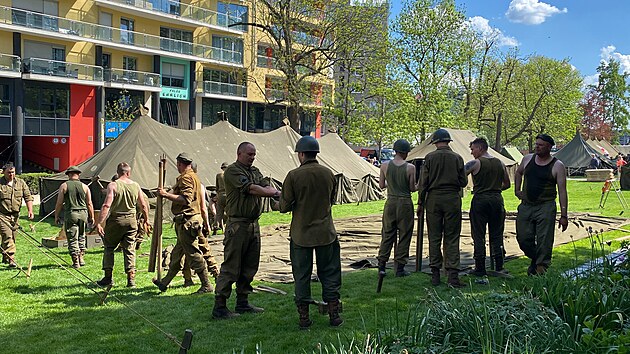 Nadšenci do vojenské historie stavěli v Šafaříkových sadech kemp 16. obrněné divize armády USA včetně polní nemocnice. (1. května 2025)