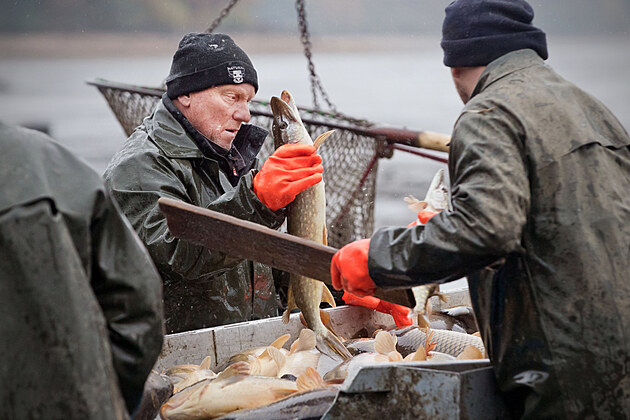 Výlov rybníka Hnačov na Klatovsku, na kterém hospodaří Klatovské rybářství. (24. října 2024)
