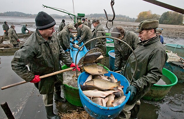 Výlov rybníka Hnačov na Klatovsku, na kterém hospodaří Klatovské rybářství. (24. října 2024)