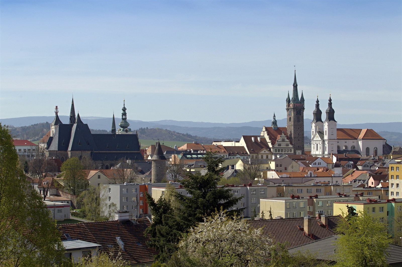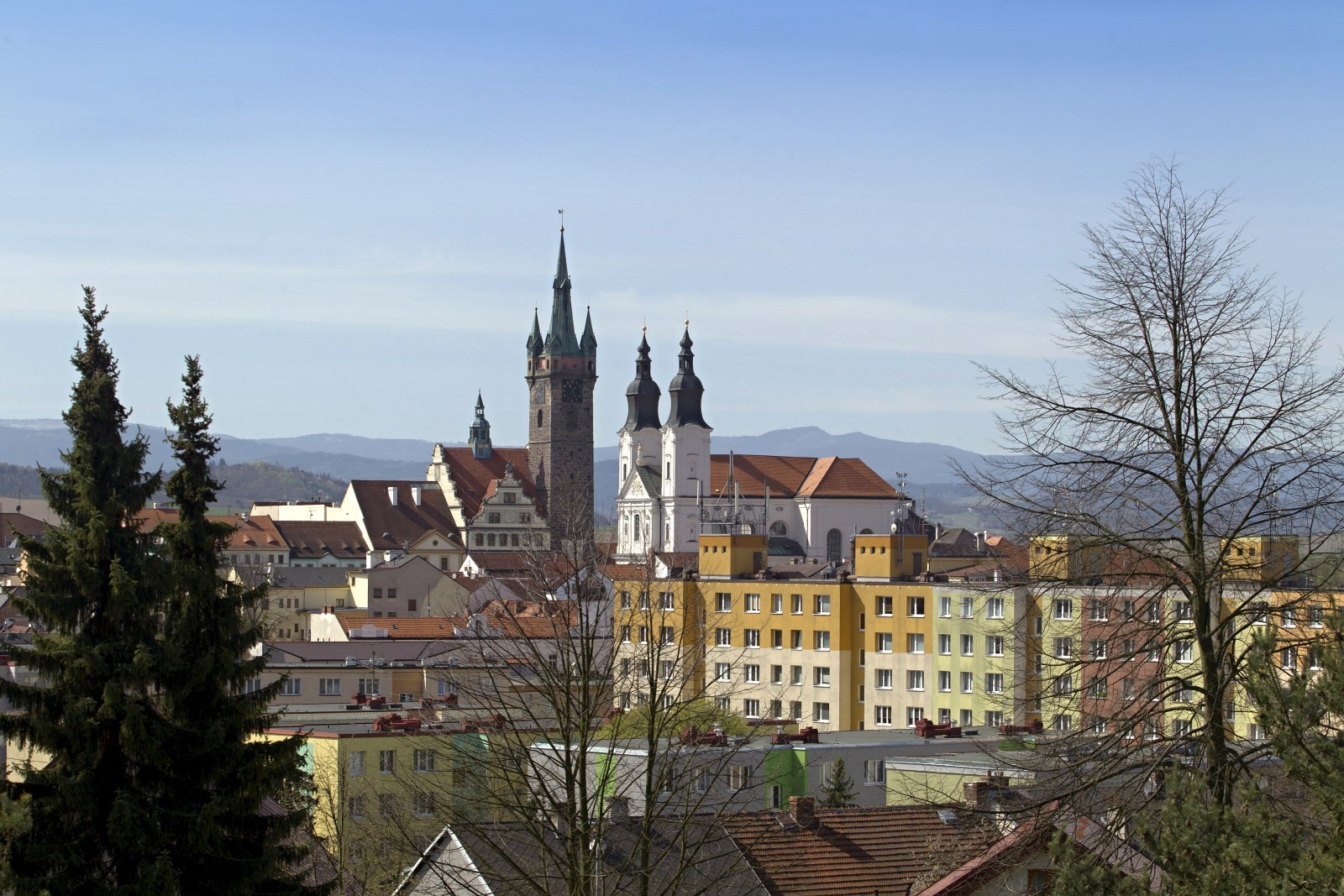 Centrum Klatov s černou věží a jezuitským kostelem, v pozadí vrcholy Malého a Velkého Javoru (15. 4. 2020)
