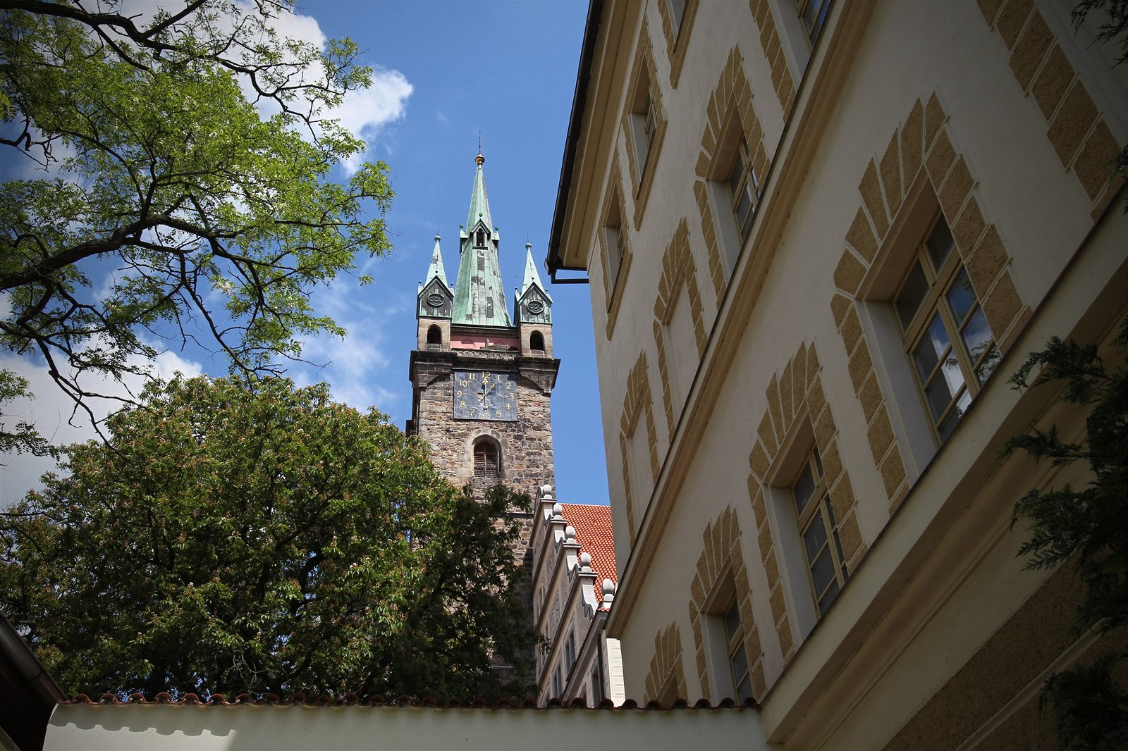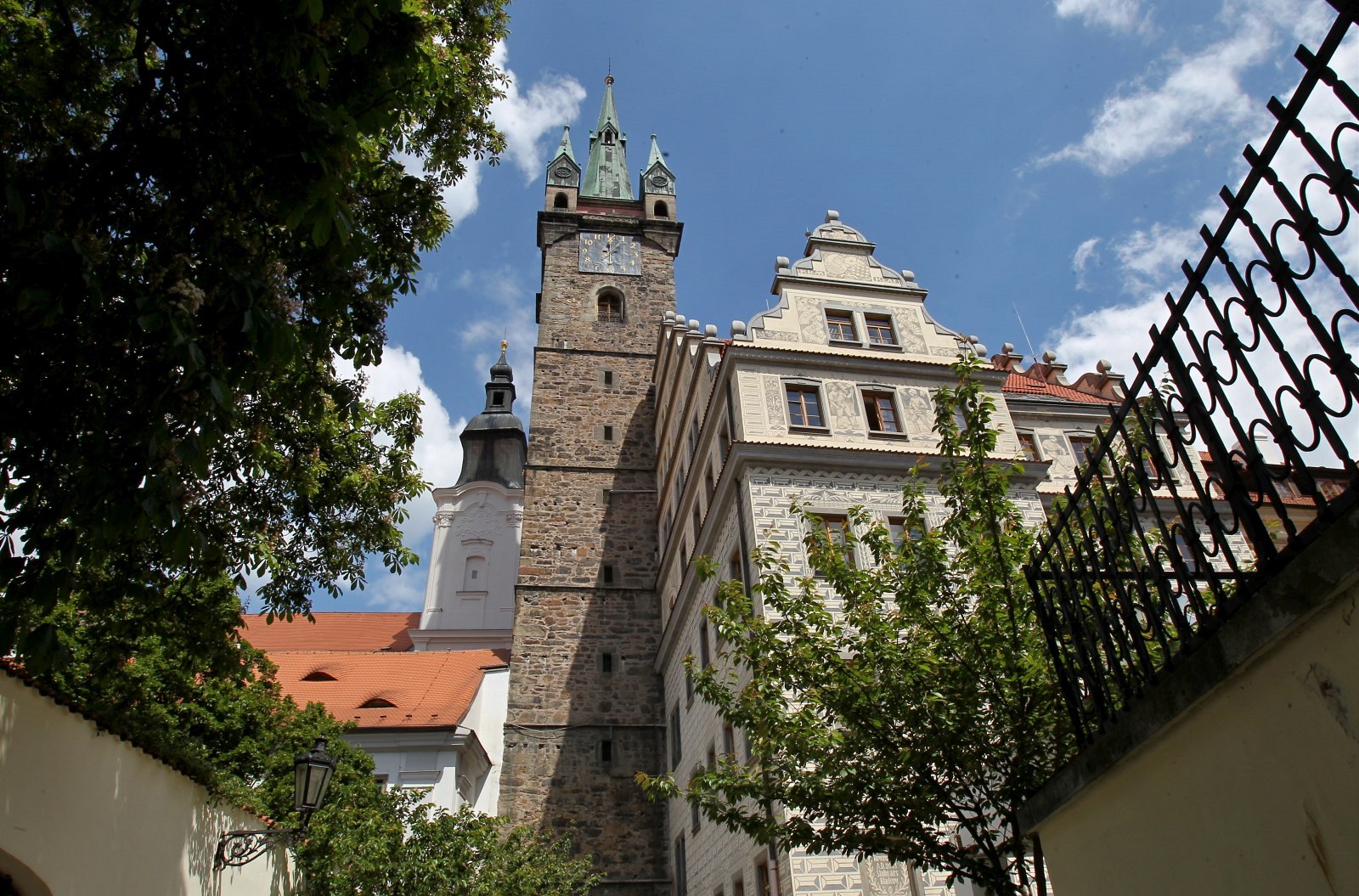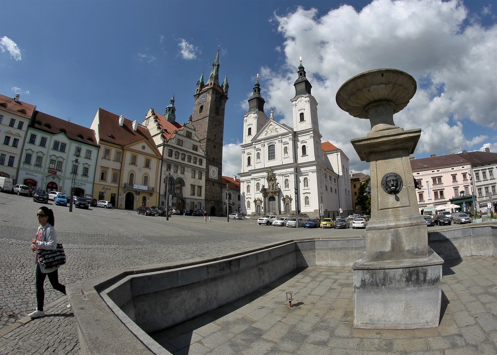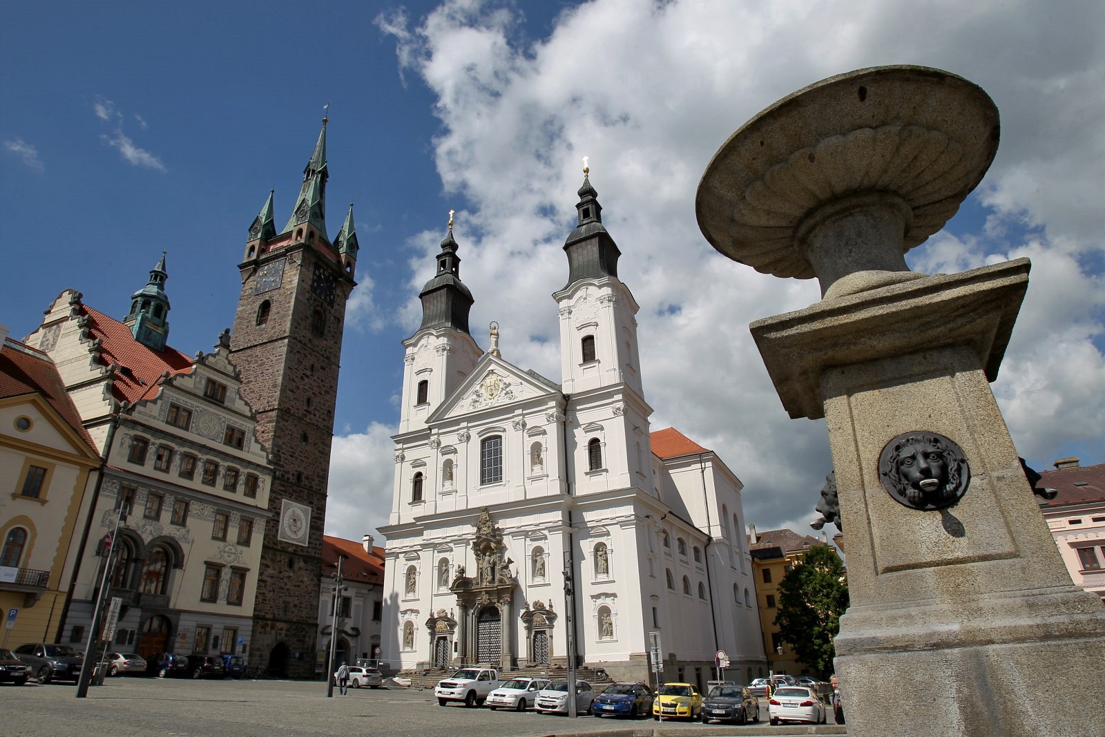 Budova radnice, kostel Neposkvrněného početí Panny Marie a sv. Ignáce a Černá věž stojí na náměstí.