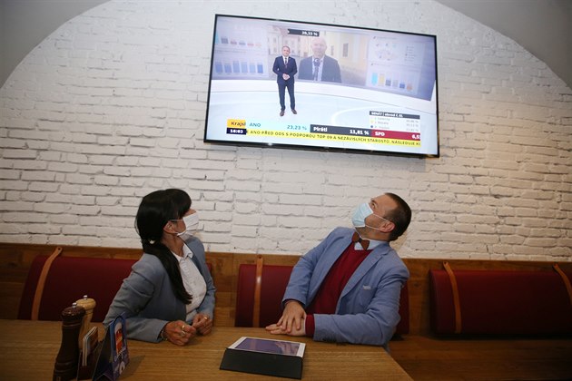 Ilona Mauritzová a Martin Baxa z ODS sledují volební zpravodajství v plzeňské restauraci. (3. 10. 2020)