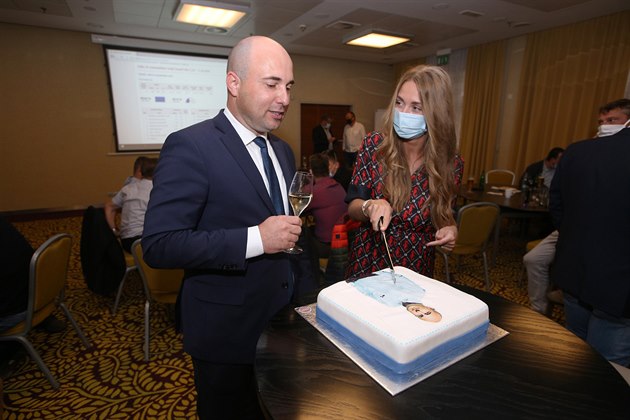 Lídr hnutí ANO v Plzeňském kraji Roman Zarzycký oslavuje s manželkou volební výsledek. (3. 10. 2020)