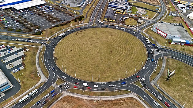 Kruhový objezd na domažlické výpadovce z Plzně má mít v budoucnu více pruhů, aby byl dostatečně průjezdný i pro automobily, které sem přivádí nový západní okruh Plzně. (1. února 2024)