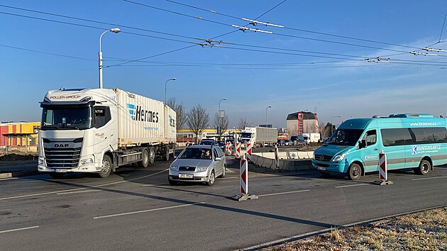 Začátek přestavby kruhového objezdu v Plzni provázely v pondělí ráno obří dopravní komplikace. (3. března 2025)