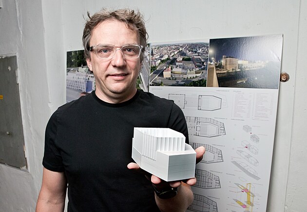 Plzeňský architekt Jiří Zábran s modelem střední části Kulturního domu Peklo, kde vznikne nový malý sál. (7. července 2025)