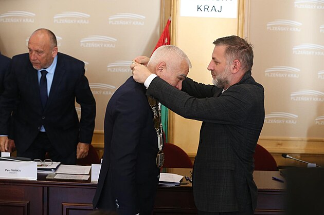 Novým hejtmanem Plzeňského kraje se stal lékař Kamal Farhan z hnutí ANO. Hejtmanský řetěz mu předal předchůdce Rudolf Špoták (Piráti). (30. října 2024)