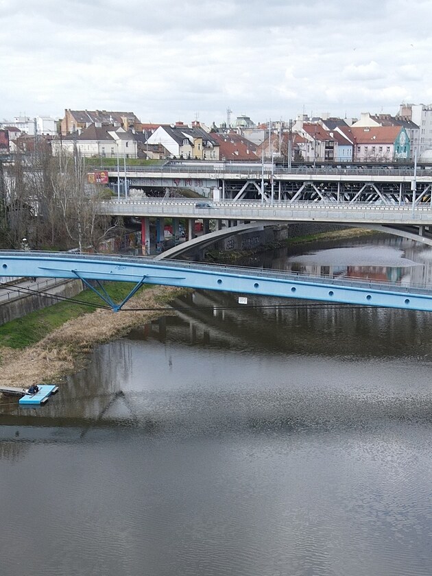 Labuťák známý jako Trenér se nečekaně vrátil na řeku Radbuzu, kde má ve zvyku prohánět trénující kanosity. Na snímku je v červeném kroužku naproti loděnici.(8. dubna 2025)