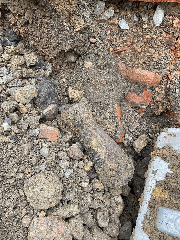 Dělník našel ve výkopu, zhruba ve dvoumetrové hloubce, předmět, který se podobal letecké pumě. (24. září 2025)