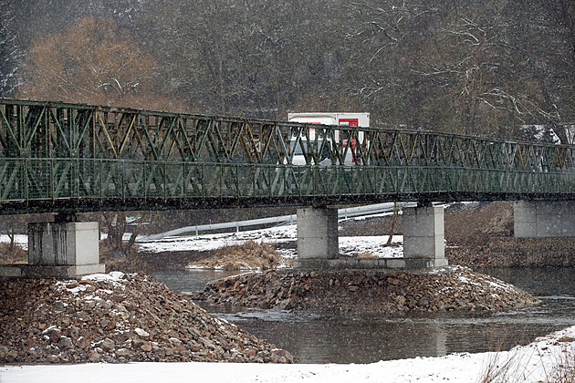 Osobní auta a autobusy jezdí přes Berounku po provizorním mostu. (12. února 2025)