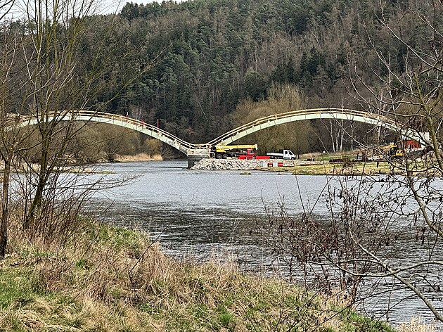 Rekonstrukce mostu přes Berounku v Liblíně na Rokycansku pokročila. Stavební firmy odstranily vozovku a většinu konstrukcí, zůstaly jen dva betonové oblouky, na nichž se most postaví znovu. (20. března 2025)
