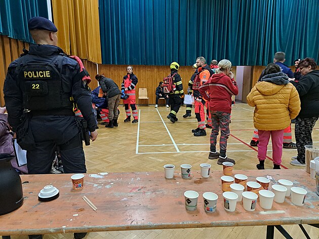 Evakuovaní obyvatelé ubytovny v Malesicích našli dočasný azyl v místní tělocvičně. (17. ledna 2025)