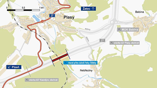 Plánek s vizualizací, kde nový most nad řekou Střelou u Plas bude stát. Je součástí obchvatu města.