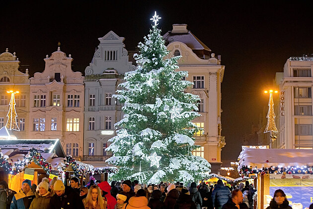 Vánoční trhy s vánočním stromem na náměstí Republiky v Plzni (5. prosince 2023)
