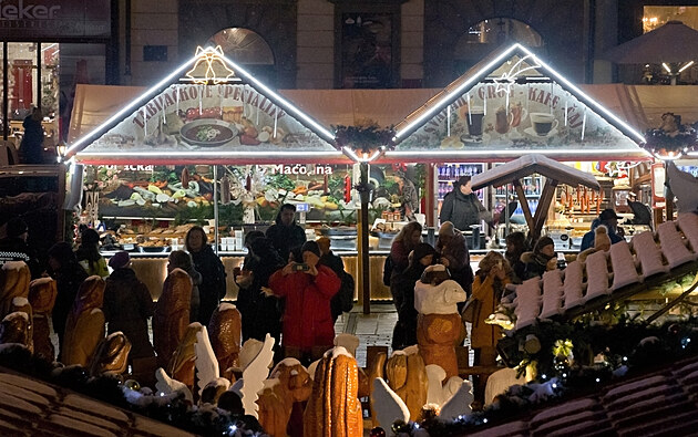 Vánoční trhy na náměstí Republiky v Plzni začaly 23. listopadu a potrvají přesně měsíc. Jejich součástí je tradiční betlém s dřevěnými sochami v životní velikosti. (29. listopadu 2023)