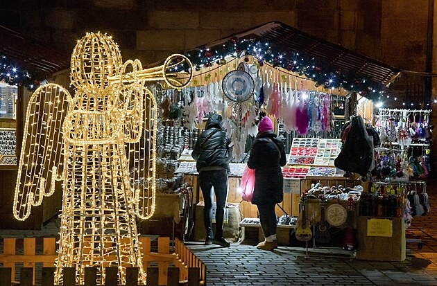 Vánoční atmosféra na plzeňském náměstí Republiky. Kromě desítek stánků s rozličným zbožím čeká na příchozí betlém s dřevěnými sochami, zvonička, živá zvířata, historický kolotoč i nasvícené ruské kolo. (29. listopadu 2023)