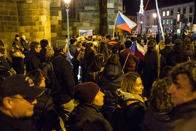 Na demonstraci, která se v Plzni na náměstí Republiky uskutečnila v neděli, se sešlo kolem 1 500 lidí. (17. 11. 2019)