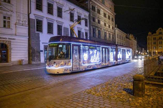 V neděli poprvé vyjela na svoji okružní jízdu po Plzni speciálně vyzdobená vánoční tramvaj. Kromě vnějšího polepu je vůz vyzdoben i uvnitř. (29. 11. 2020)