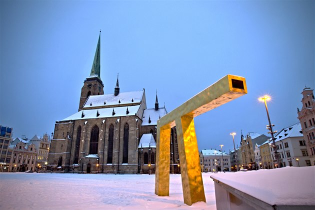 Plzeňské náměstí Republiky a katedrála svatého Bartoloměje se sněhem (9. února 2021)