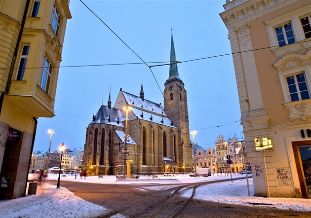 Plzeňské náměstí Republiky a katedrála svatého Bartoloměje se sněhem (9. února 2021)