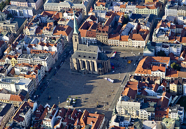 Náměstí Republiky a kostel sv. Bartoloměje v Plzni (8. září 2021)