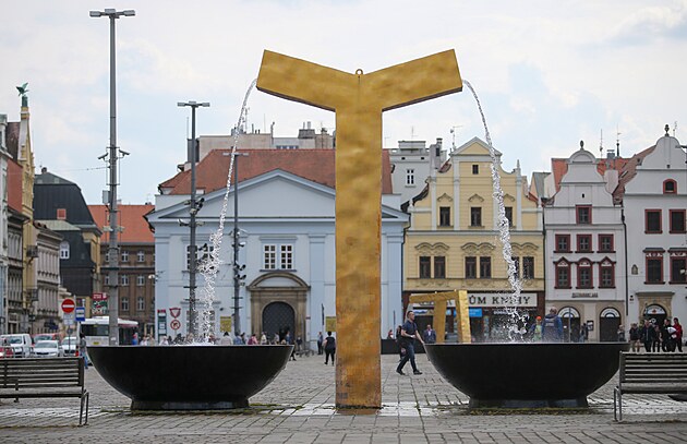 Kašny na náměstí Republiky v Plzni začaly po zimní odmlce opět chrlit vodu. (2. 5. 2022)