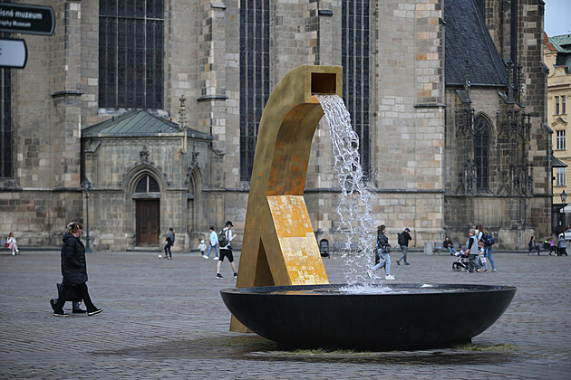 Kašny na náměstí Republiky v Plzni začaly po zimní odmlce opět chrlit vodu. (2. 5. 2022)