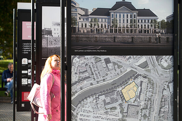 Plzeňský kraj představil na výstavních panelech před Západočeským muzeem v Plzni návrhy na revitalizaci budovy někdejších městských lázní. Ta chátrá, v budoucnu má být sídlem Západočeské galerie. (25. října 2023)