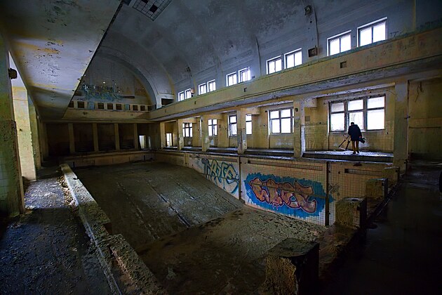 Interiér opuštěných Městských lázní v Plzni. Ve velkém bazénu se učily plavat generace Plzeňanů. (5. prosince 2022)