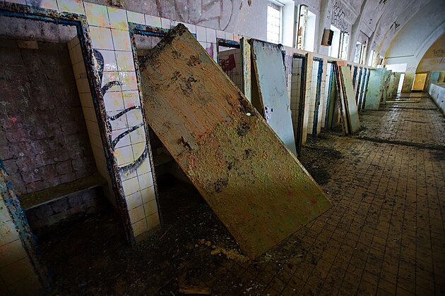 Interiér opuštěných Městských lázní v Plzni, bývalé převlékárny v patře (5. prosince 2022)