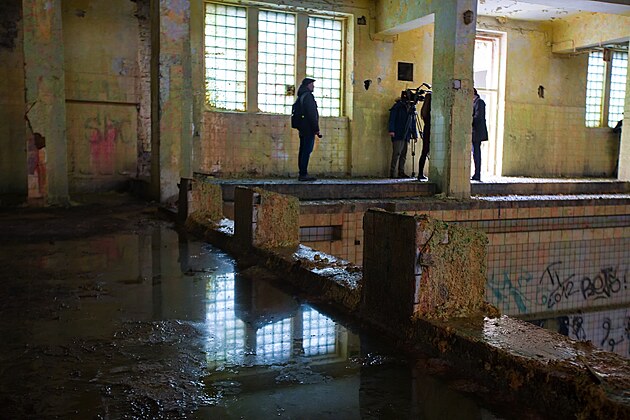 Interiér opuštěných Městských lázní v Plzni. Do budovy i zatéká. (5. prosince 2022)